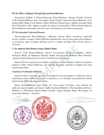 Excerpt of brevet conferring the Cross of Honor and Merit on H.A.H. Pope Radislav I (then Marquis of Monte Titano).