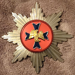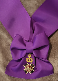are 2 grades of the order: The cross of the order is worn from a purple ribbon. The knights and dames grand cross use a sash in the ribbon over the right shoulder and a star in silver with a central red medallion, blue cross, and gold Roman eagle. Knights/Dames of Honour wear the cross of the order on a neck ribbon. Wear of Deocrations of the Pontifical and Imperial Orders