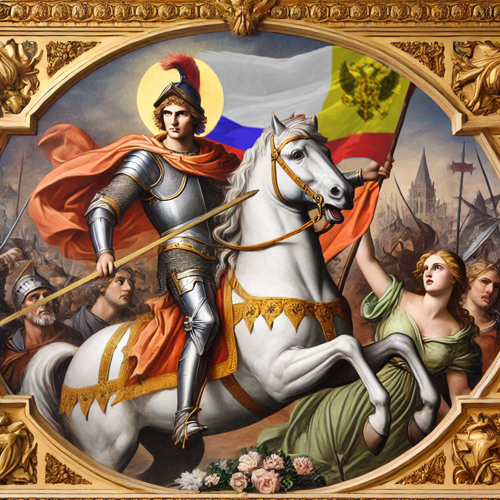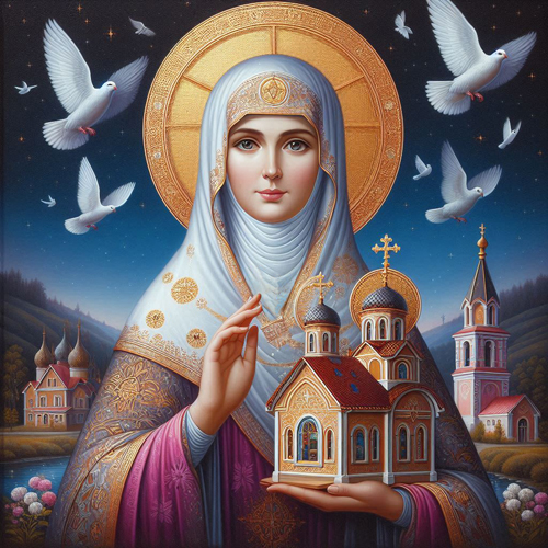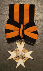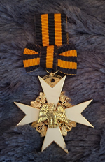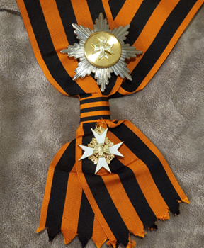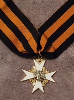 Saint Olga was Grand Princess consort of Kiev and ruled the Old Russian State (Kievan Rus') as Regent on behalf of her son after her husband was assassinated. She is highly regarded for her efforts to spread the Catholic faith in her territory, which culminated in her grandson, Saint Vladimir the Great, making the Christian faith the official religion. She is also an ancestress of several royal and noble houses in Central and Western Europe, including the French Capetian and Bourbon dynasties. ![]() St. Olga Equal-to-the-Apostles The order is given only in one rank, that of Knight or Dame. In rare and exceptional cases in recognition of the highest service, the office and distinction of Grand Commander may be conferred. Although the order ranks immediately after the Companions of the Pontifical Order of the Eagle, the honour of Grand Commander of Sts. George and Olga ranks first among dynastic honours and immediately after the Aquiline Order of Christ and Most Holy Pontifical Order of the Eagle. Also, Grand Dukes of Rome-Ruthenia receive this order, along with the Aquiline Order of Christ, on their 18th birthday. The insignia consists of a gold Roman Eagle centred upon a white eight-pointed cross with gold eagles in between. The cross is worn by Knights pendant from an orange and black striped neck ribbon, and by Dames pendant from a bow of the same ribbon. The Grand Master, Grand Dame (Apostolic Princess of Rome-Ruthenia), and Grand Commanders may wear the insignia on a broad ribbon sash in the colours of the order over the right shoulder. The colours are imperial yellow and black, with the yellow tinged with the red of the martyrs. Wear of Deocrations of the Pontifical and Imperial Orders