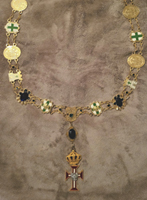 ribbon about the neck. The small cross is worn on a gold collarette and/or on a cordon (sash) of