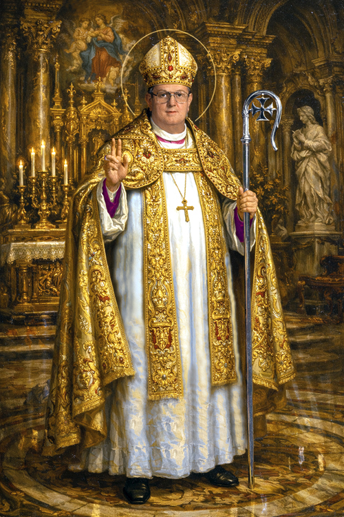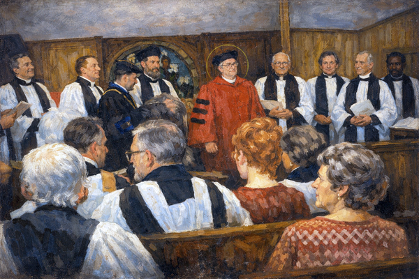 Commemorative artwork depicting St. Edwin Caudill (in scarlet academic gown)