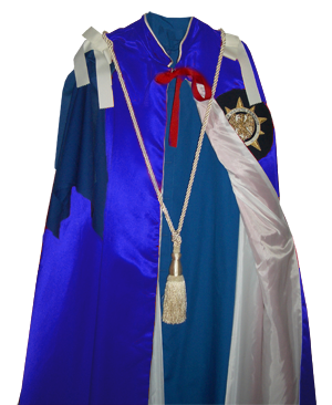 Uniform Service Ribbons: Bailiff of Honour (granted prior to 2024;thereafter for the heirs of the Knights of Christ), Knight Grand Cross, Commander, and Knight ![]() Church robes of Bailiffs of Honour (worn over a scarlet habit with matching fascia and gold tassel) The church mangle in royal blue with red lining is worn over this habit. The cap is red velvet with gold cords and a brim. Clerics wear a 4-winged red biretta with pompom, unless a cardinal, in which case the regular Cardinal's watered silk biretta is worn. ![]() Church Robes of Knight and Dame Companions of the Pontifical Order (through the rank of Knight/Dame Grand Cross) For Bailiffs of Honour, the lining and trim instead are red. The cap is black velvet with gold cords and a brim. Clerics wear their usual biretta. Bishops and Prelates of the Pontifical Court also wear their proper cassock.