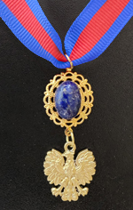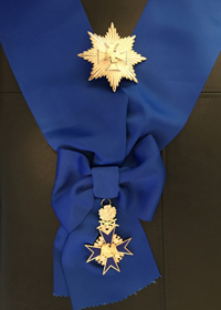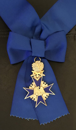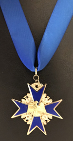 Principle: Corpus Christi 2nd: Sacred Heart 3rd: Immaculate Conception of the B.V.M. 4th: Invention of St. Stephen 5th: St. Patrick Wear of Deocrations of the Pontifical and Imperial Orders The primary ribbon of the Companions of the Pontifical Order of the Eagle is a rich shade of royal blue, which symbolizes the coat of arms of the Prince-Bishop of Rome-Ruthenia. For Bailiffs of Honour (those granted the honour prior to 2024 and their heirs, and heirs of Knights/Dames of Christ), the ribbon for the special neck insignia is red and blue, representing the significance of Rome, St. Peter, and St. Stephen. The order's cross is an elegant blue with eight points, featuring a majestic Roman Eagle at its center and additional Eagles positioned between each of the four main points. Both Bailiffs of Honour (granted separated prior to 2024; thereafter held only by heirs to the Order of Christ) and Knights/Dames Grand Cross proudly display the cross of the order on a sash worn over their right shoulder. These crosses are gracefully suspended from a gold oak leaf cluster embellished with diamonds and crossed swords. Bailiffs of Honour and Knights/Dames Grand Cross also have the honor of wearing a golden star adorned with a golden eagle upon a golden cross.